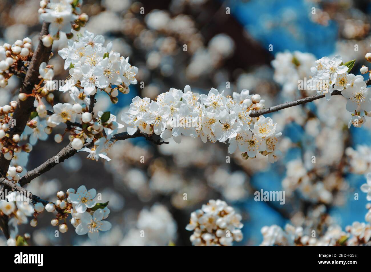 Blooming cherry blossom tree garden in spring. White flowers on branches in fruit orchard with cherry and apple trees. Beautiful nature. Flower season Stock Photo - Alamy