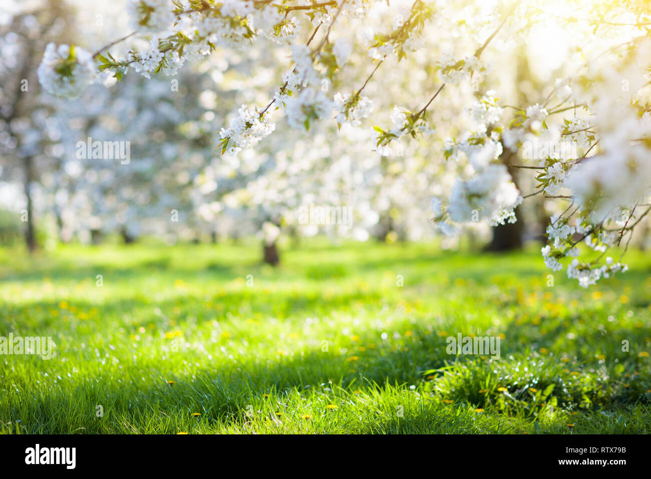 Cherry blossom branches in spring sun rays. Blooming beautiful white flowers Stock Photo - Alamy